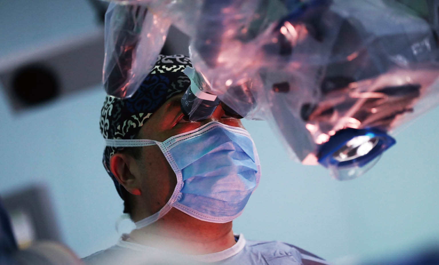 分子可視化手術(shù)導(dǎo)航系統(tǒng),使“不可見”的病理診斷數(shù)據(jù)真正“ 可見”,實現(xiàn)了針對神經(jīng)腫瘤分子級別的切除。圖為毛穎教授手術(shù)